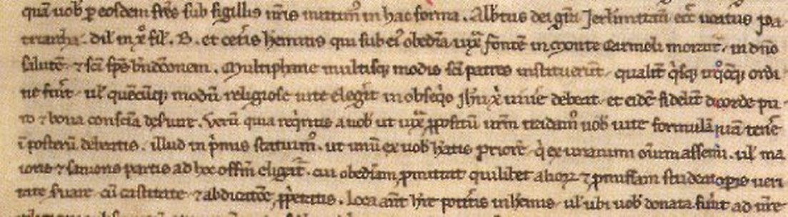 - Albert, par la grâce de Dieu Patriarche de l’Eglise de Jérusalem, à ses chers fils dans le Christ, B. et les autres ermites, qui vivent sous son obéissance, au Mont Carmel, près de la source, salut dans le Seigneur et bénédiction du Saint-Esprit.
